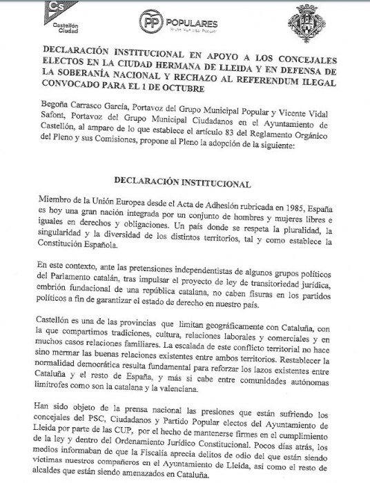 La portavoz popular, Begoña Carrasco, lamenta que el PSOE de la ciudad de Castellón, con Amparo Marco al frente, haya sido incapaz de sumarse a su grupo y a Ciudadanos para defender la unidad de España, respetar la  Constitución Española y dar apoyo a todos los cargos públicos que han sido señalados y acosados por negarse a secundar las órdenes separatistas en Cataluña, como es el caso de los concejales de Lleida, ciudad hermanada con Castellón. Una Declaración Institucional cuyo texto fue negociado con los propios socialistas, en el que se incorporaron las aportaciones que ellos hicieron.