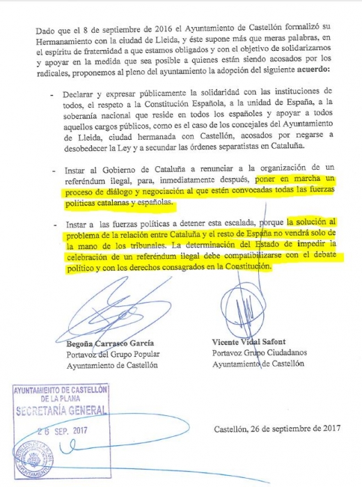 La portavoz popular, Begoña Carrasco, lamenta que el PSOE de la ciudad de Castellón, con Amparo Marco al frente, haya sido incapaz de sumarse a su grupo y a Ciudadanos para defender la unidad de España, respetar la Constitución Española y dar apoyo a todos los cargos públicos que han sido señalados y acosados por negarse a secundar las órdenes separatistas en Cataluña, como es el caso de los concejales de Lleida, ciudad hermanada con Castellón. Una Declaración Institucional cuyo texto fue negociado con los propios socialistas, en el que se incorporaron las aportaciones que ellos hicieron.