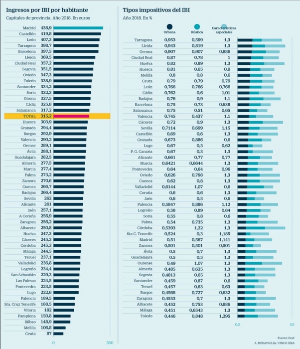 Madrid es la primera que más ingresa por IBI, con una recaudación prevista de 428,9 euros por habitante para 2018 a la que le sigue Castellón (419,8 euros), y León (407,3 euros).